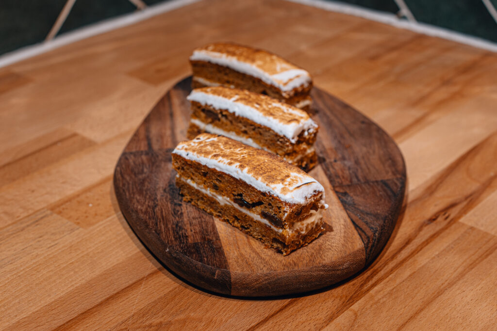 Gâteau aux carottes, raisins secs et cranberries surmonté d’une fine couche de meringue italienne