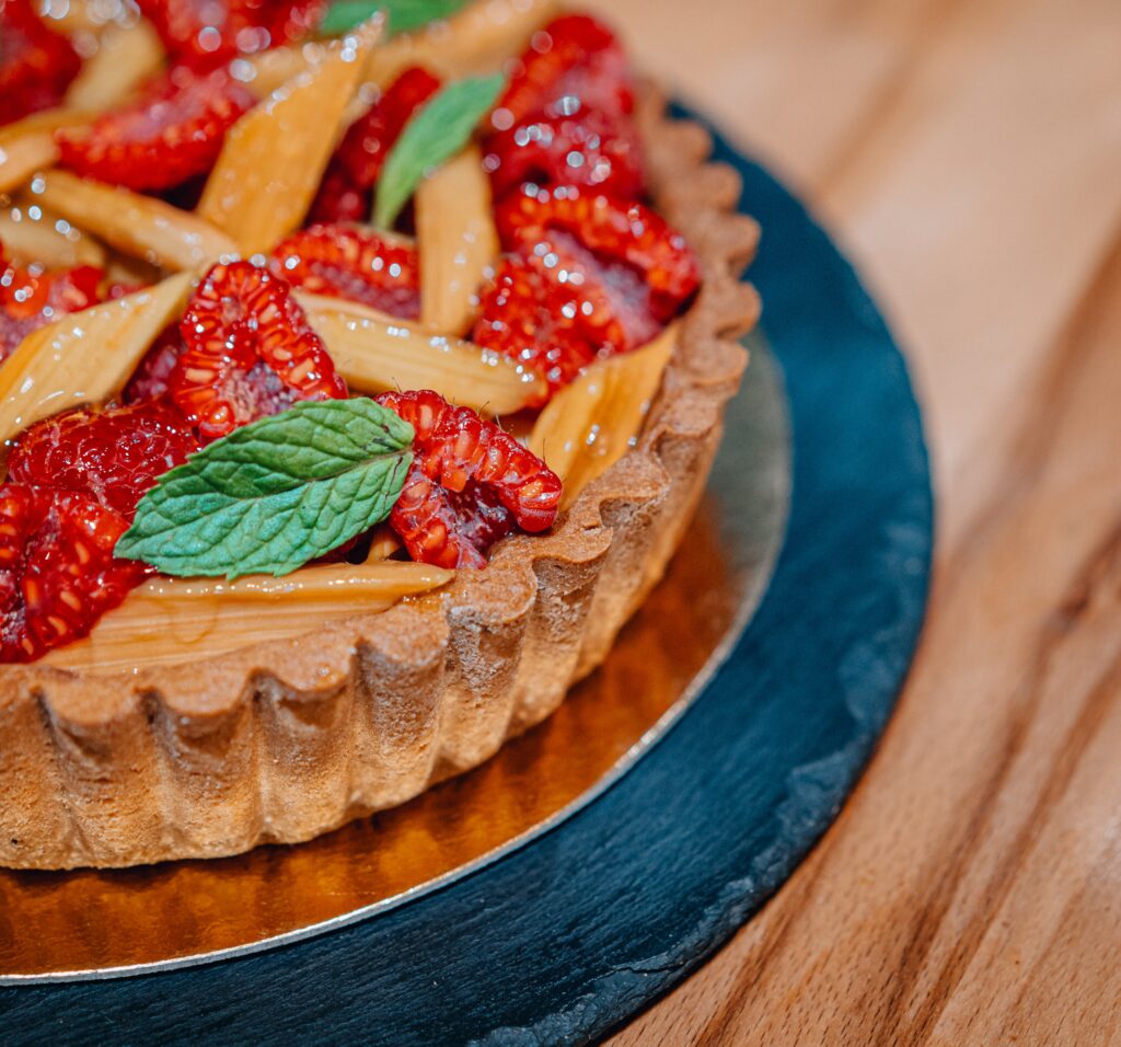 Tarte framboise et rhubarbe du jardin Pâte sablée garnie d’un biscuit madeleine surmonté de fruits frais Individuel 4,50 € 6 personnes 25 € Disponible sous 48h. Composition :Farine, sucre, beurre, oeuf, rhubarbe, framboises Commander